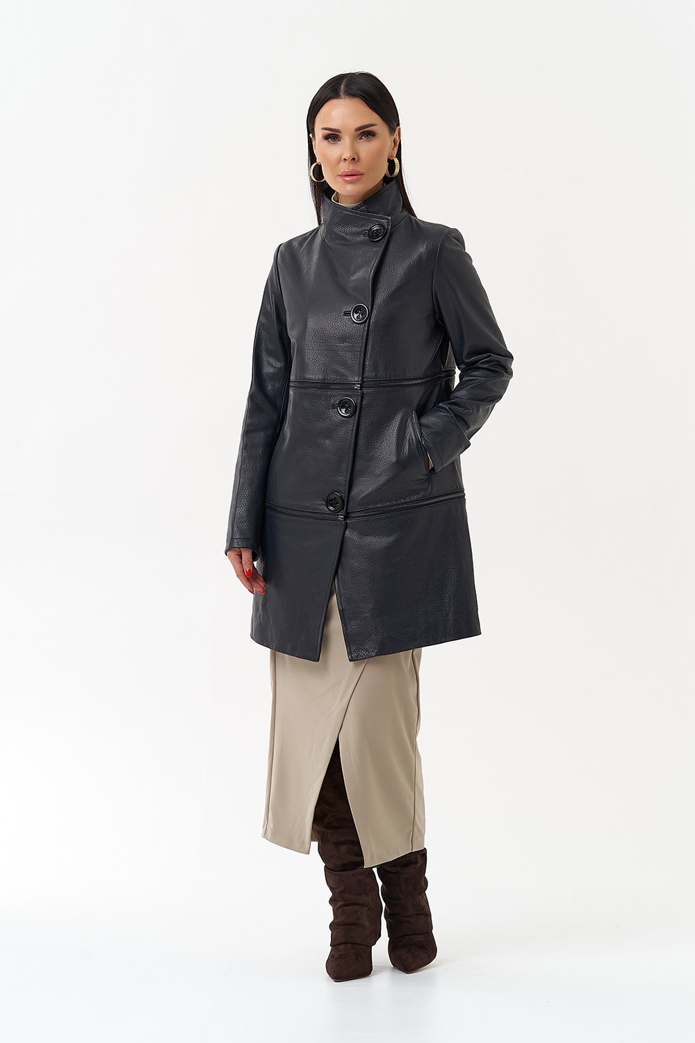 Плащ-трансформер из натуральной бараньей кожи в синем цвете в полуприлегающем фасоне. Подойдет для тех, кто любит перемены! Данное изделие можно носить в трех вариациях: укороченная кожаная куртка, классическая кожаная куртка и плащ. Акцентными деталями этой модели является ворот-стойка и большие пуговицы. Прочная и износостойкая кожа даст возможность сохранить ваше изделие на долгие годы, а количество вариаций образов с данной моделью позволит вам всегда оставаться в тренде.